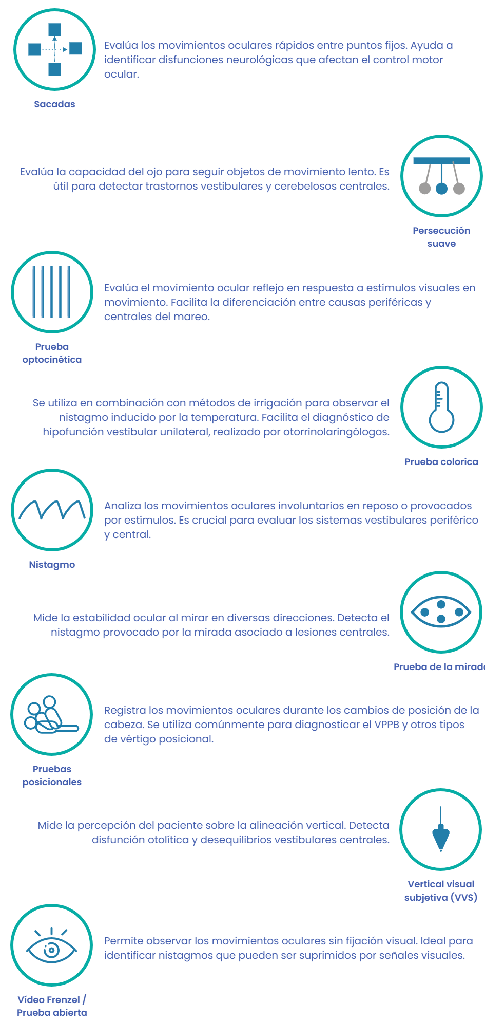 Le système comprend 9 protocoles de base : saccades, suivi fluide, optocinétique, regard, nystagmus, positionnel, vertical visuel subjectif (SVV), vidéo de Frenzel et soutien calorique.