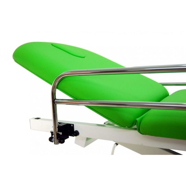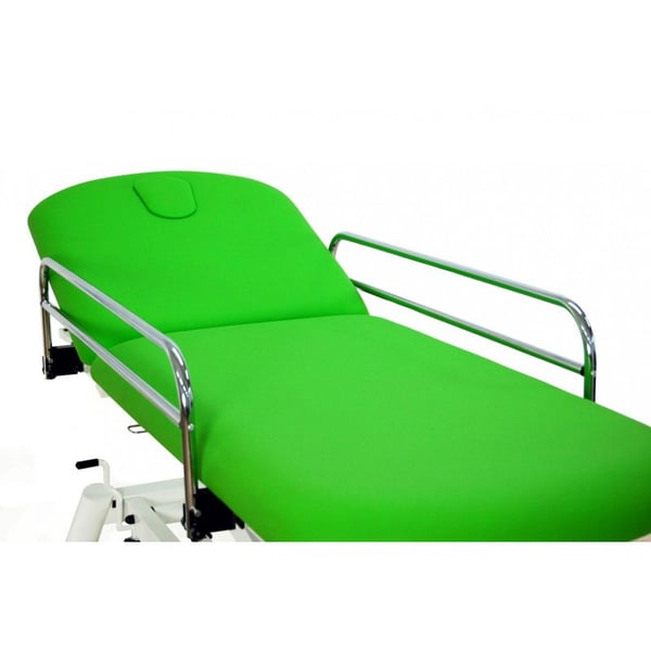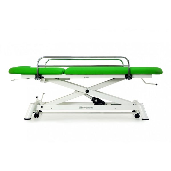 Brancard d'examen électrique : deux sections avec élévation droite sans déplacement latéral, mains courantes, porte-rouleau, prise faciale et roues rétractables