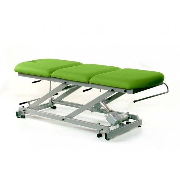 Brancard d'examen électrique à trois sections, avec pli central manuel, porte-papier hygiénique et capuchon facial . Il offre la possibilité d'ajouter des roues escamotables . Spécialement conçu pour les traitements de physiothérapie et de rééducation .