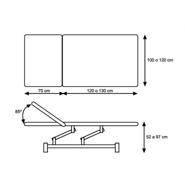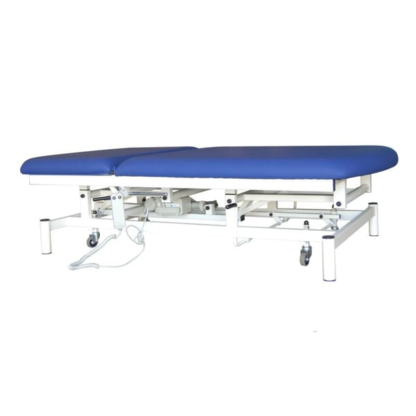Table de massage électrique Bobath à deux sections. Il a un dossier inclinable et des roues escamotables . Deux tailles disponibles : 190cm x 100cm ou 200cm x 120cm