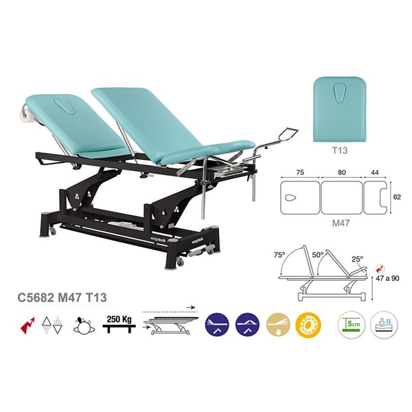 Brancard électrique, Ecopostural, idéal pour les spécialités : trois corps avec structure à bielle noire et tête T13 (62 x 200 cm)