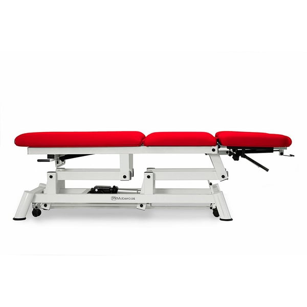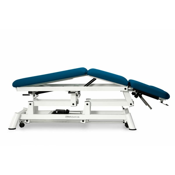 Brancard électrique pour ostéopathie à cinq corps avec dossier inclinable négatif , accoudoirs sur le dossier réglables en hauteur et en ouverture, avec roues escamotables et bouchon facial . Disponible avec l'option d'un modèle Trendelenburg compensé avec un pli central.