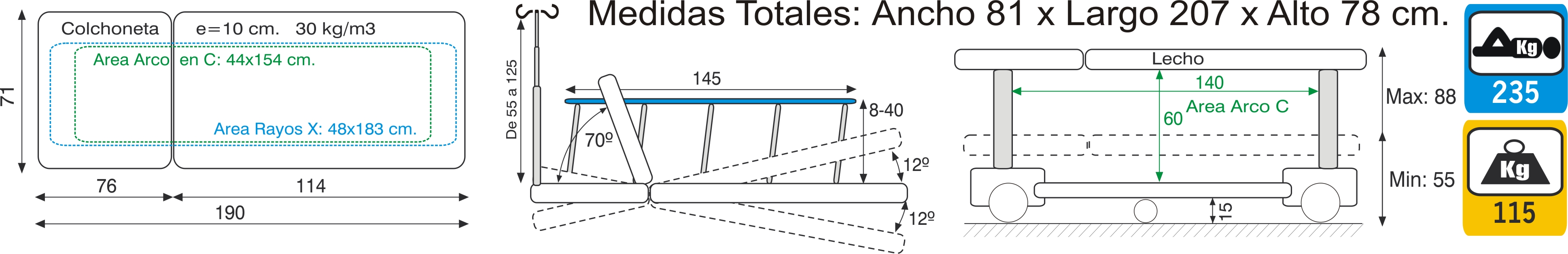 STRUCTURE : Elle a été développée pour supporter un rythme de travail accéléré, avec un équilibre entre résistance, stabilité et légèreté optimales, et la rigidité nécessaire à la RCP. Son cadre est équipé de protections en caoutchouc thermoplastique. La conception et sa structure garantissent une grande stabilité et une capacité de charge statique et uniformément répartie jusqu'à 250 kg.