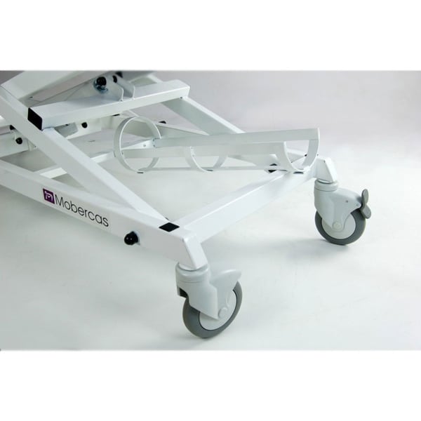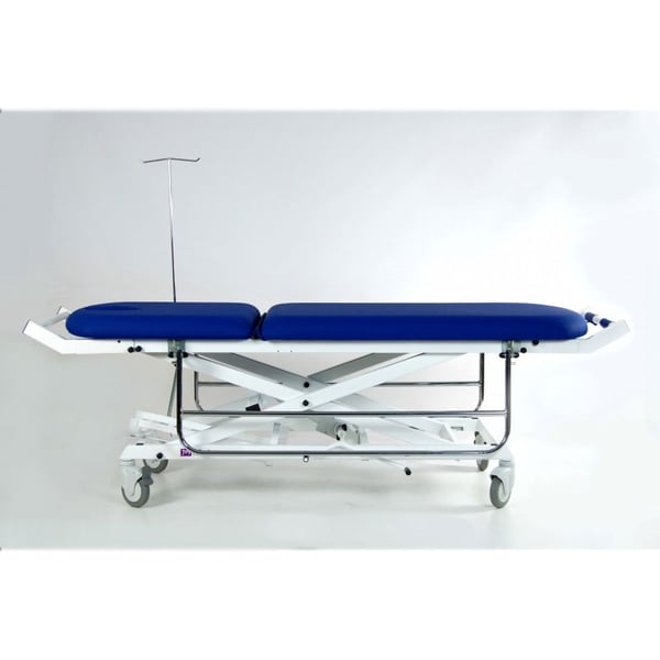 Chariot de transfert hydraulique bicorps . Il est équipé de mains courantes, d'une potence à perfusion, d'un porte-bouteille, de poussoirs amovibles et pliables (tête et pieds) et de roues de transport de 125 mm .