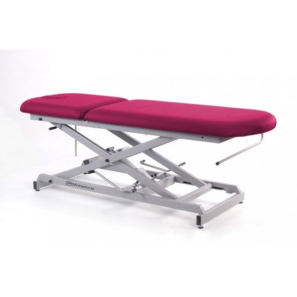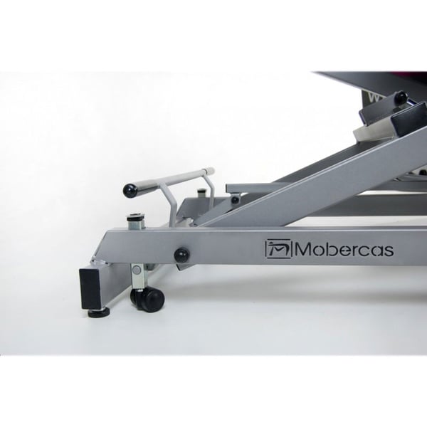 Civière d'examen hydraulique à deux corps . Il a une montée droite sans mouvement latéral, avec un porte-papier toilette et un capuchon facial . Disponible avec option roues rétractables .