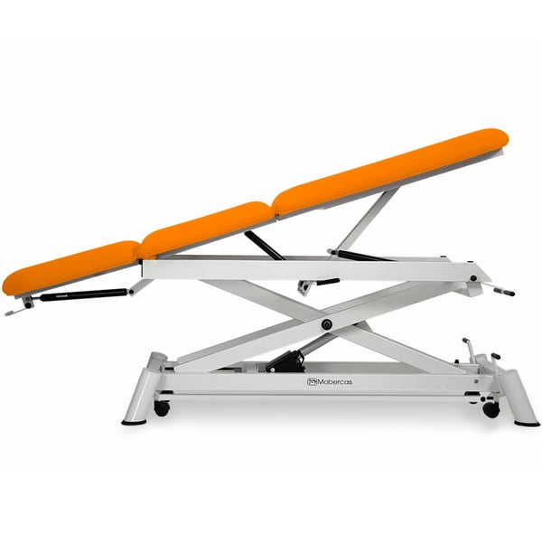 Civière d'ostéopathie électrique en trois parties, avec dossier à inclinaison négative, pli central et montée droite sans mouvement latéral. Comprend un capuchon facial et des roues rétractables . Il s'agit d' une position Trendelenburg utilisant deux pistons à gaz.