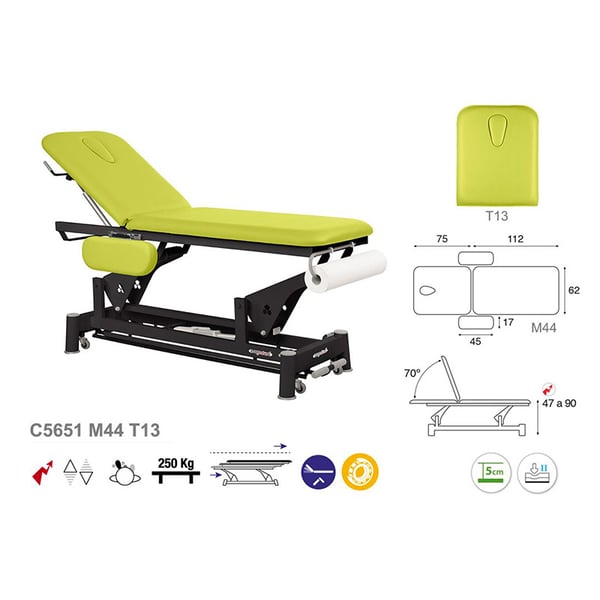 Nouvelle civière écoposturale à deux corps, moderne et polyvalente, avec système de levage électrique et structure à bielle noire. Il se compose de bras repliables, d'une tête oscillante, d'un capuchon facial , d'un rembourrage en mousse de différents degrés de fermeté et d'un revêtement de classe M2. De même, il dispose d'une structure en acier de bielles avec roulements et roues rétractables qui facilitent son mouvement latéral .
