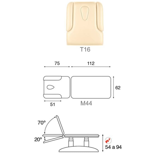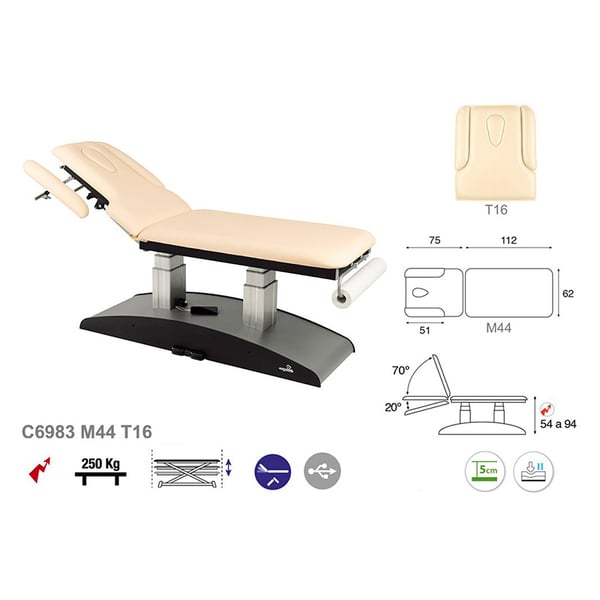 Civière électrique écoposturale : Élévation verticale de 54 à 94 cm, tête inclinable jusqu'à 90º et deux corps (62x188 cm)
