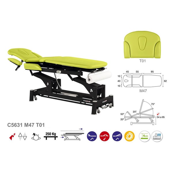 Civière électrique écoposturale multifonctionnelle : trois corps avec structure à bielle noire, bras repliables et appui-tête T01 (62 x 200 cm)