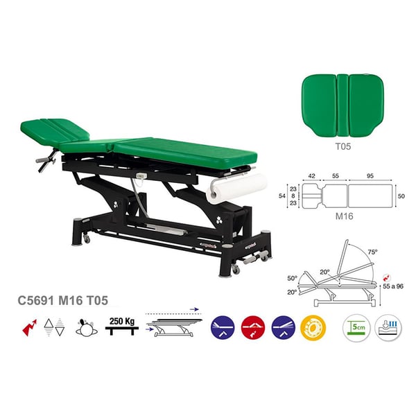 Civière électrique écoposturale multifonctionnelle : trois corps avec structure à bielle noire et appui-tête T05 (50 x 198 cm)