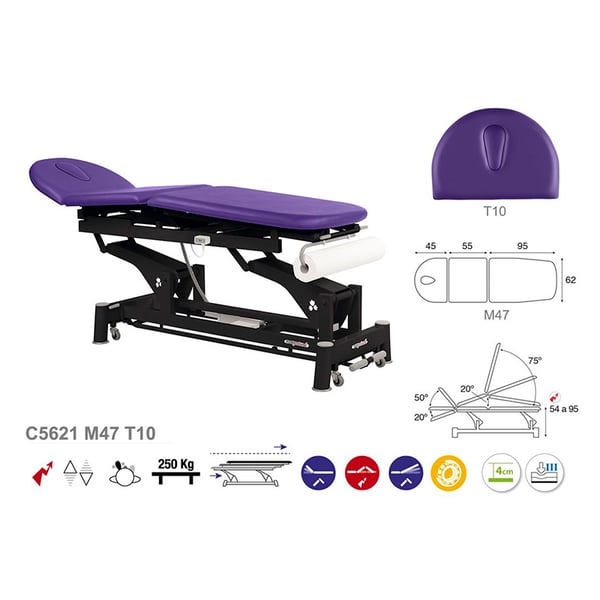 Civière électrique écoposturale multifonctionnelle : trois corps avec structure à bielle noire et tête T10 (62 x 200 cm)
