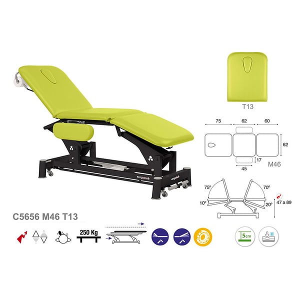 Civière électrique écoposturale : trois corps, avec bras repliables, structure à bielle noire et appui-tête T13, inclinaison négative jusqu'à 10º (62 x 198 cm)