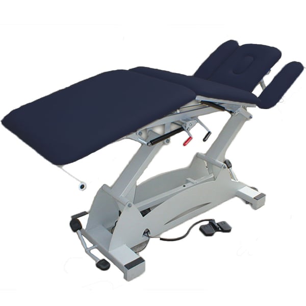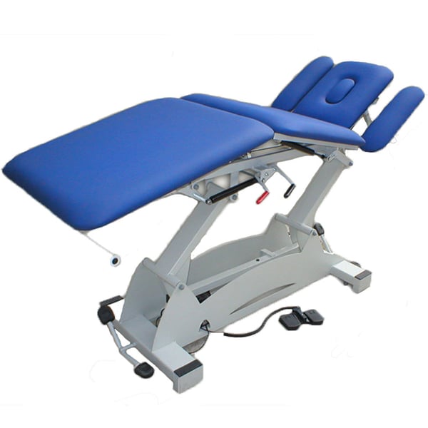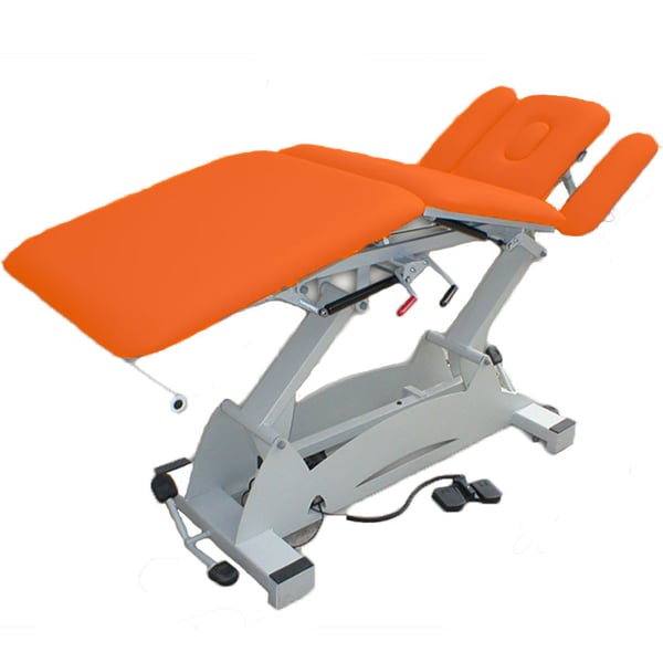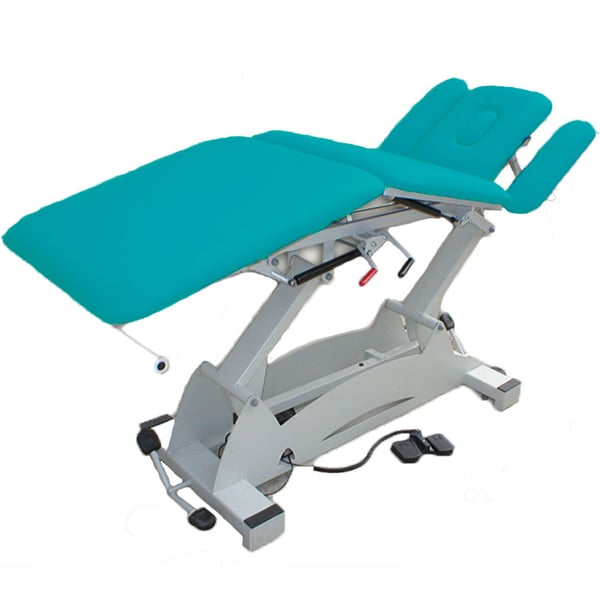 - Le lit du brancard avec 5 corps rabattables à piston pouvant être relevés de 48 cm à 90 cm grâce à un système électrique utilisant des pédales au sol pouvant être placées des deux côtés du brancard, permettant au professionnel de s'adapter facilement au thérapie à effectuer.