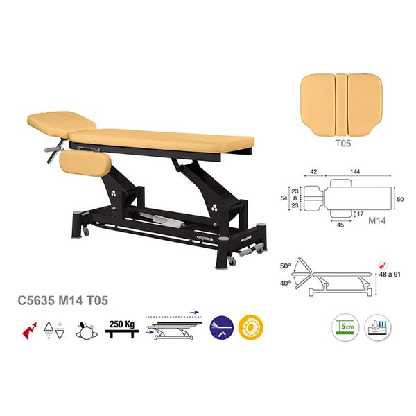 Civière électrique technique écoposturale : deux corps avec bras repliables, structure à bielle noire et appui-tête T05 (50 x 188 cm)