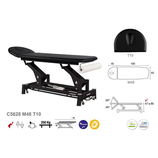 Civière électrique technique écoposturale : deux corps avec structure à bielle noire et appui-tête T10 (62 x 207 cm)