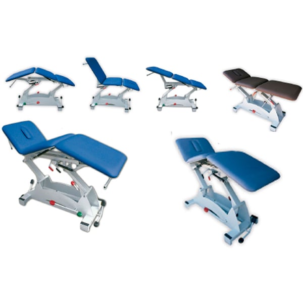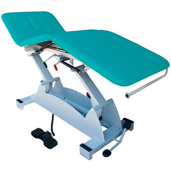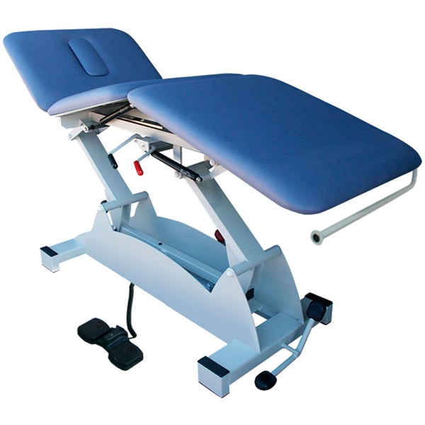 - Le lit du brancard à 3 corps repliables par piston pouvant être relevé de 48 cm à 90 cm grâce à un système électrique utilisant des pédales au sol pouvant être placées des deux côtés du brancard, permettant au professionnel de s'adapter facilement au thérapie à effectuer.