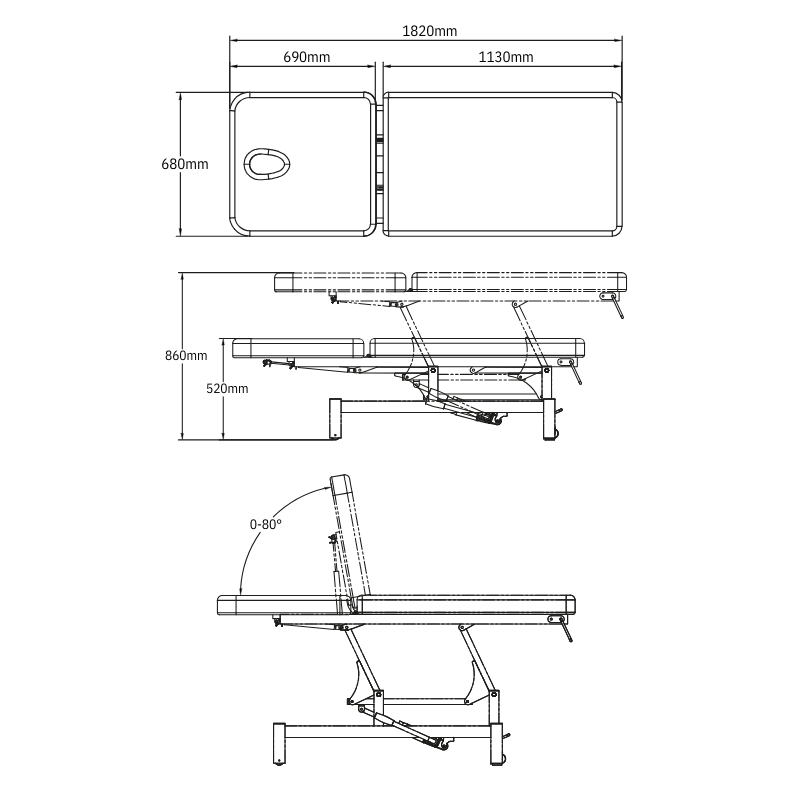 Il est composé de deux sections : un dossier inclinable jusqu'à +80° et une ouverture pour le visage pour un meilleur confort du patient. La sellerie en PVC haute résistance est disponible en gris ou en bleu, avec un matelas de 5 à 7 cm d'épaisseur garantissant durabilité et hygiène. Il est équipé d'un distributeur de papier toilette intégré , de roulettes verrouillables et de pieds antidérapants pour une stabilité optimale.
