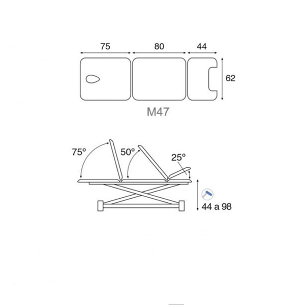 Civière hydraulique écoposturale : trois corps, avec structure en ciseaux de couleur blanche. Idéal pour les spécialités médicales (62 x 200 cm)