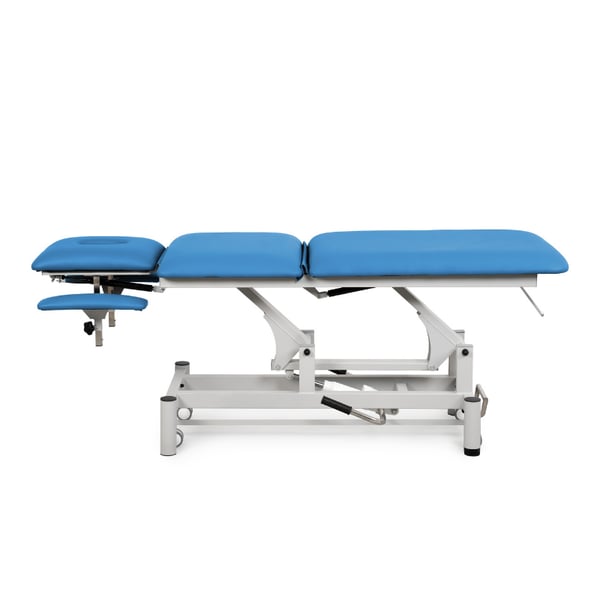 Civière hydraulique à 5 sections avec appui-tête réglable et ouverture faciale et accoudoirs réglables, idéale pour le massage, la physiothérapie et la rééducation.