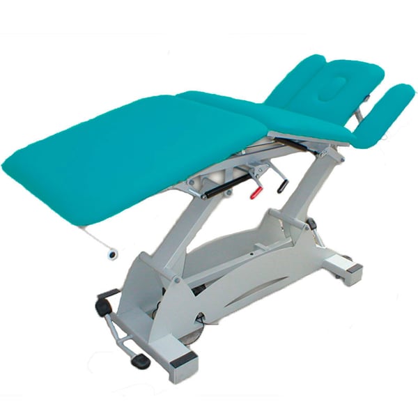- Le lit du brancard comporte 5 corps rabattables par piston avec leviers bilatéraux. La hauteur peut être augmentée de 48 cm à 90 cm grâce à un système hydraulique à pédale placé au centre du brancard, permettant au professionnel de s'adapter facilement à la thérapie à effectuer.