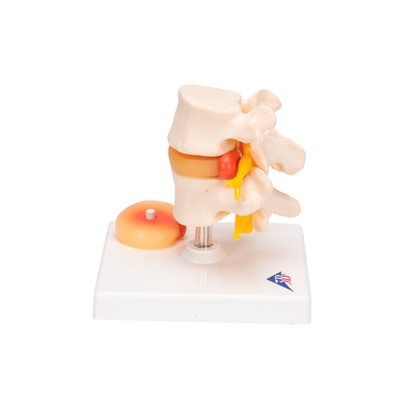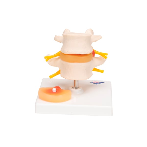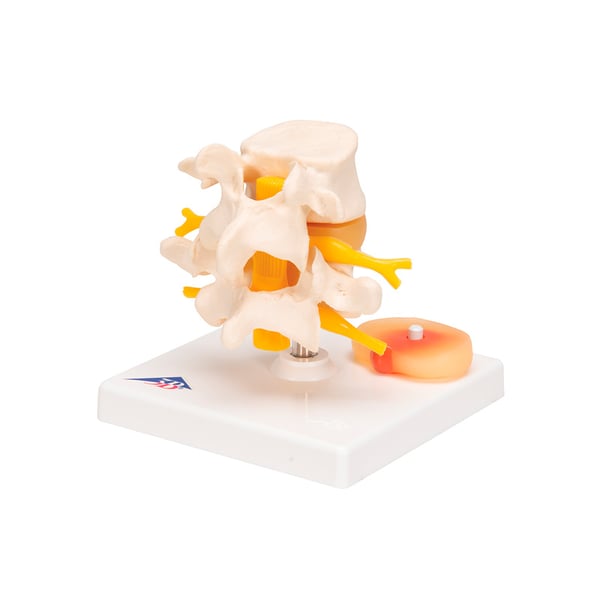 Ce modèle de disque vertébral est composé de deux vertèbres lombaires avec des nerfs vertébraux, une dure-mère spinale et deux hernies discales médianes et latérales interchangeables entre la 4e et la 5e vertèbre lombaire.