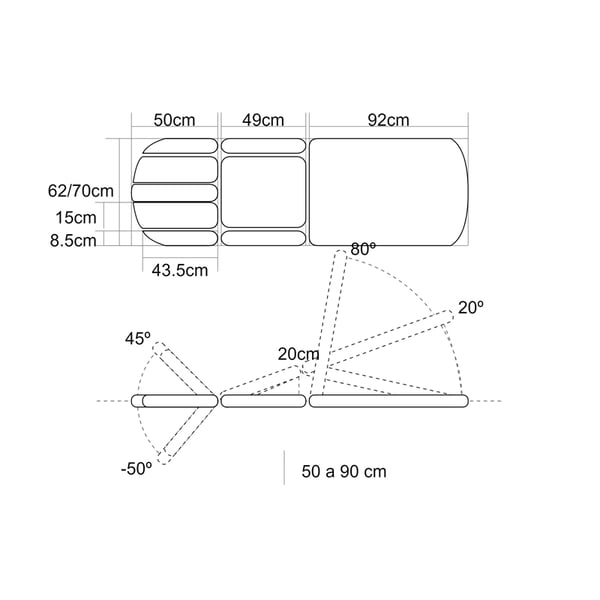 - Fonctionnalités grâce à deux pistons à gaz : pied de lit (troisième corps), pli central, Trendelenburg