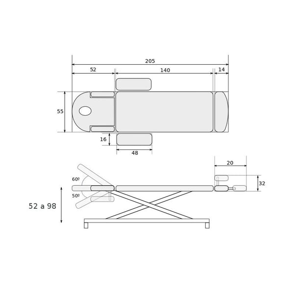 Brancard hydraulique multifonctionnel pour l'ostéopathie à sept corps . Il se compose d' une montée droite sans déplacement latéral, d'un bouchon frontal et de roues escamotables . De plus, il dispose d'un dossier inclinable négatif avec accoudoirs, accoudoirs latéraux et repose-pieds réglables et amovibles .