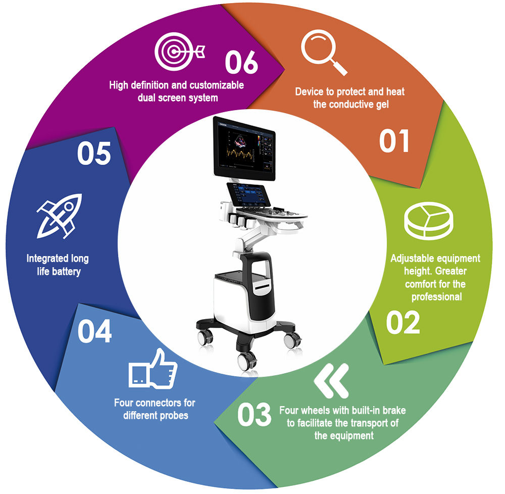 L'équipe Chison CBit 9 dispose de la meilleure technologie du marché. L'appareil est doté d'un énorme écran LED HD de 21,5 pouces qui offre une zone d'image de 90 % avec le mode écran, ainsi qu'un écran tactile entièrement personnalisable de 10,1 pouces, afin que le professionnel puisse revoir jusqu'au moindre détail des ultrasons qu'il effectue.