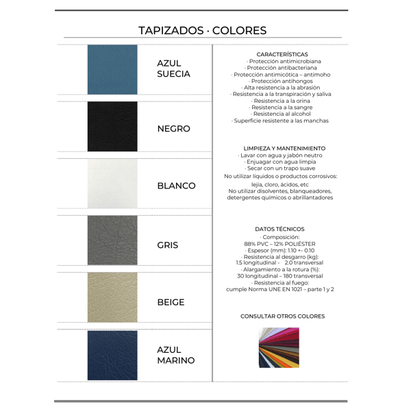 - Revêtement et rembourrage en cuir synthétique de la couleur de votre choix, ignifugé , avec intérieur en mousse spongieuse haute densité.