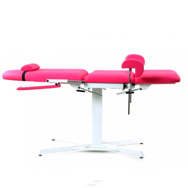 Fauteuil de gynécologie à hauteur fixe : trois sections, avec tours de cuisses, plateau amovible, accoudoirs et coussin cervical