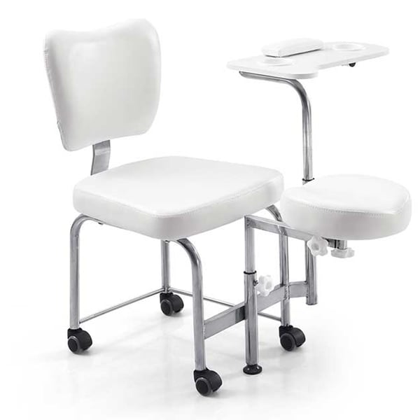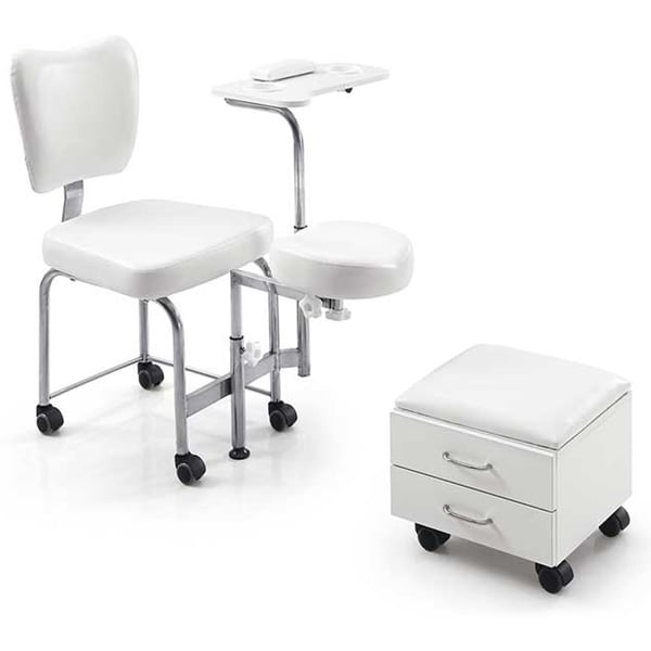 Fauteuil de pédicure incorporant tabouret avec deux tiroirs tiroir de rangement, les deux roues. Il est équipé d' un plateau latéral rotatif et réglable avec coussin repose- mains et bols de manucure inclus, ainsi que d' un repose-pieds réglable.