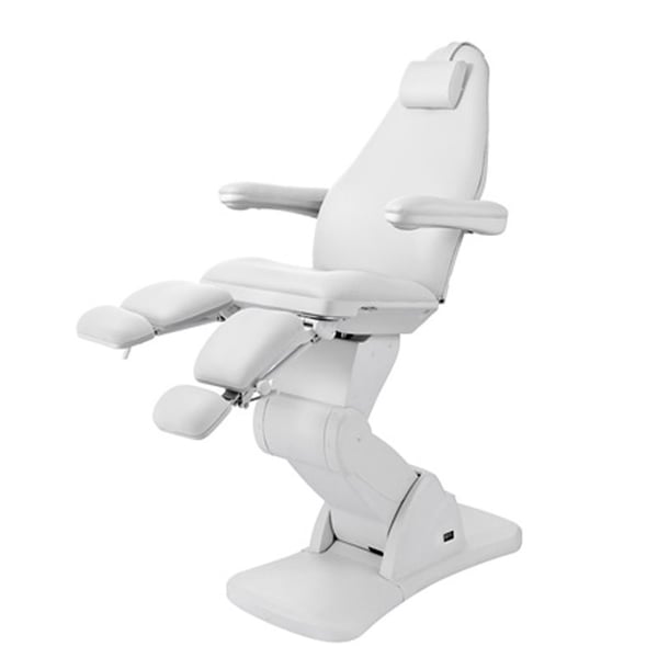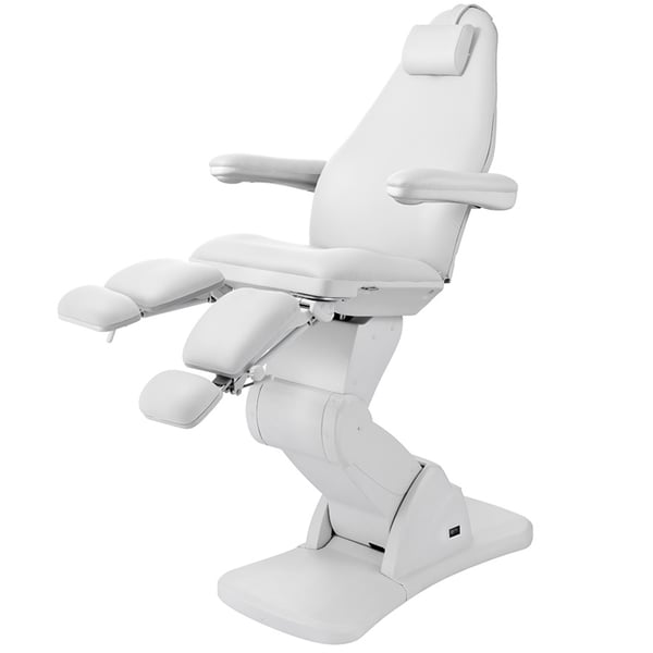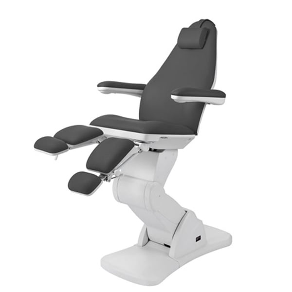 Fauteuil de podologie haut de gamme avec une structure très stable équipée de trois moteurs qui contrôlent la hauteur, le dossier et l'inclinaison de l'assise. Il dispose d'accoudoirs rabattables et d'un coussin appui-tête amovible avec trou pour le visage, de repose-pieds réglables indépendamment à l'aide d'un vérin à gaz qui régule leur hauteur et d'une ouverture latérale jusqu'à 90°.