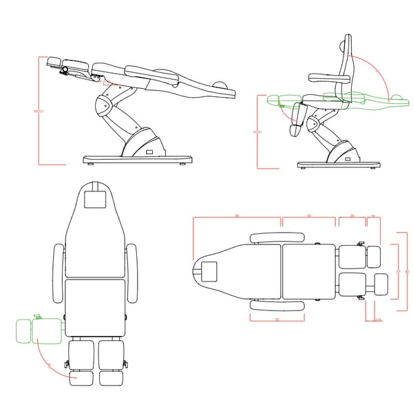 Fauteuil de podologie électrique Cubo : Trois moteurs qui contrôlent la hauteur, le dossier et l'inclinaison du siège