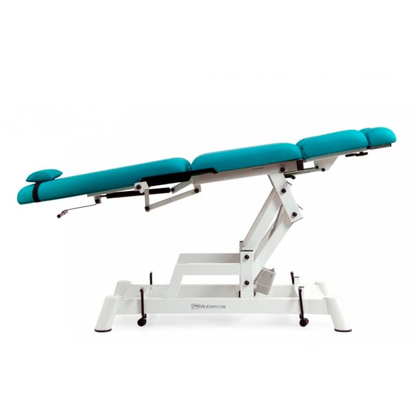 Fauteuil de podologie électrique en trois sections . Réglage de la hauteur par commande manuelle. Comprend des accoudoirs inclinables à 90° (métal et rembourrés), des repose-jambes indépendants et extensibles , et un coussin cervical ergonomique . Inclut également une position de Trendelenburg compensée .