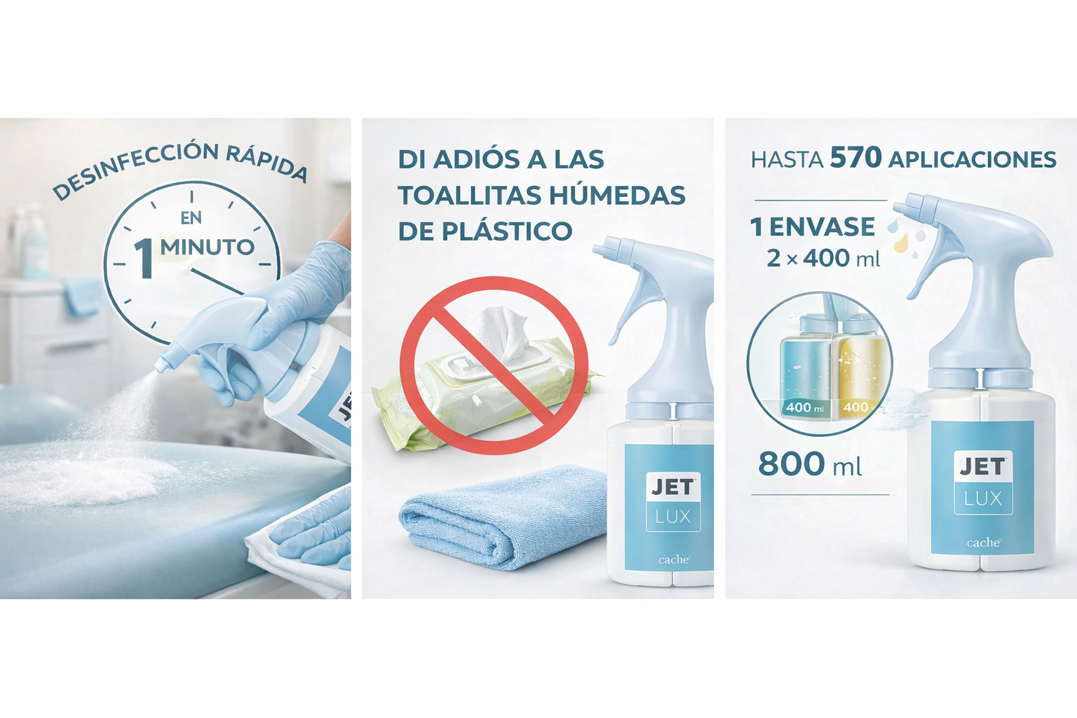 Sa formule, la plus légère de la gamme JET , permet une application homogène sans laisser de résidus agressifs, protégeant ainsi l'équipement technologique et la sécurité du patient et du professionnel.