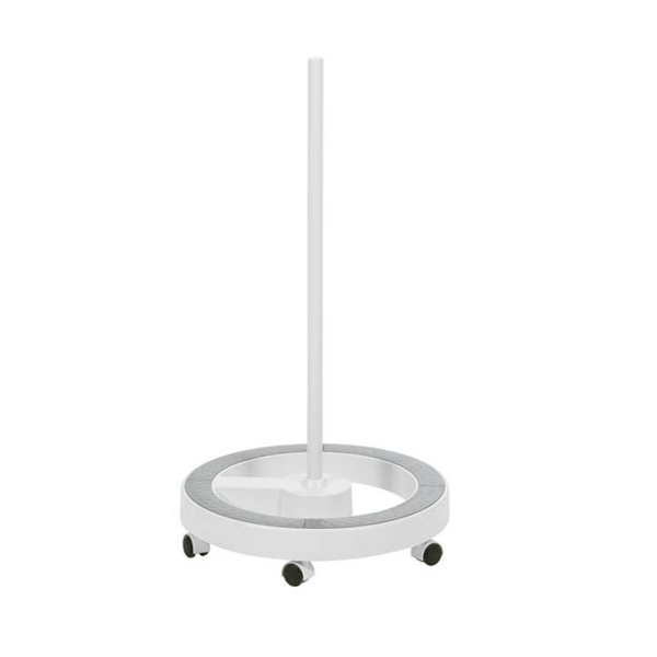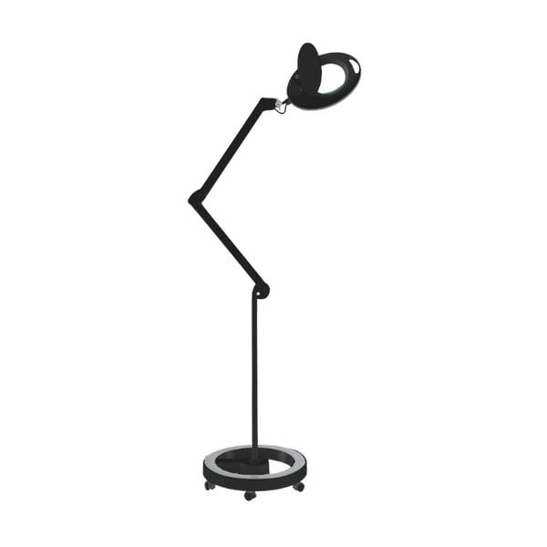 Lampe loupe équipée d' un bras articulé et d'une base compacte à 5 roulettes pour une stabilité maximale .