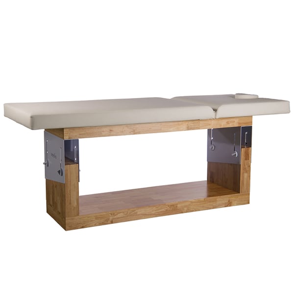 Occi Wooden Spa Bed, à deux sections, fixe et au design minimaliste en bois naturel de haute qualité. Système innovant de réglage en hauteur, réglable en trois positions préréglées et inclinaison manuelle du dossier en trois positions. Rembourrage grand confort avec rembourrage blanc en PU de haute qualité et facile à nettoyer.