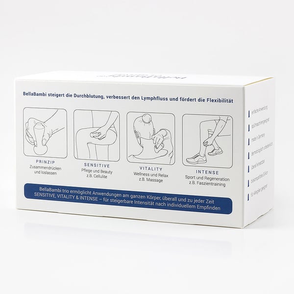 Le principe Bella Bambi s'appuie sur cette thérapie par ventouses de renommée mondiale. Fabriqué en silicone doux pour la peau, Bella Bambi crée un vide après l'avoir placé sur votre peau. Ce vide produit un effet qui varie selon l’intensité. Avec de doux mouvements latéraux du Bella Bambi, vous pouvez effectuer un massage et mobiliser le fascia.