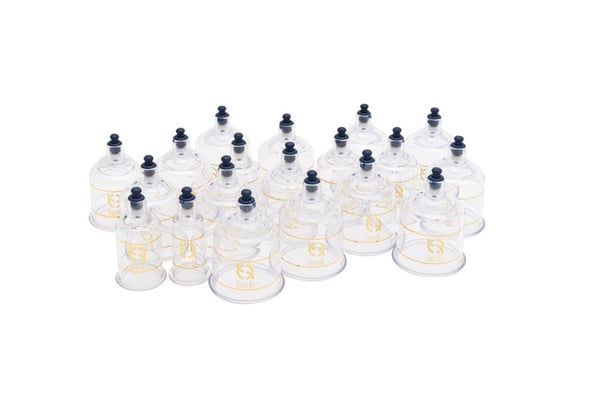 Ensemble de 19 ventouses, avec valves magnétiques , pistolet et tuyau pour l'auto-application. Il a 5 mesures . Présenté dans un étui en métal et similicuir .