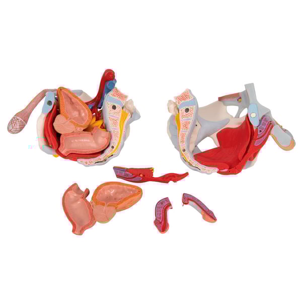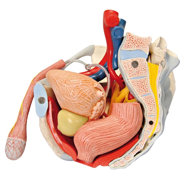 Le rectum, la vessie, la prostate et le pénis sont amovibles. Ils peuvent être séparés en deux par une coupe à leur médiane. La structure osseuse est fixée par des aimants et peut donc être facilement séparée en toutes ses parties. En ce qui concerne le pénis, dans certaines parties, le fascia et la peau ont été partiellement séparés, de sorte que les vaisseaux et les nerfs sont visibles. Dans la zone du scrotum et du cordon spermatique, la peau a également été partiellement enlevée. Les testicules et l'épididyme sont visibles. Dans la partie gauche, le cordon spermatique a été découvert en couches, et dans la partie droite, le M. cremaster et le fascia spermatique ont été exposés à l'intérieur.