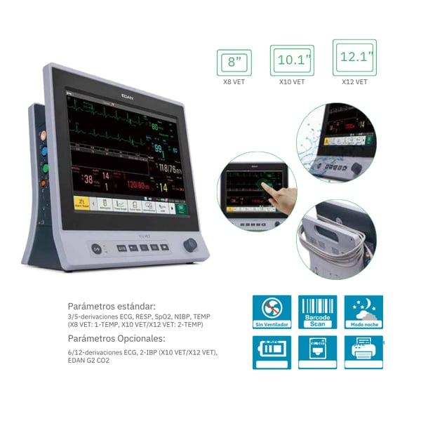 Moniteur patient multiparamétrique portable, avec les mêmes fonctionnalités que le X12 VET, mais avec un écran TFT-LCD couleur de 8". NE SUPPORTE PAS LE MODULE PI