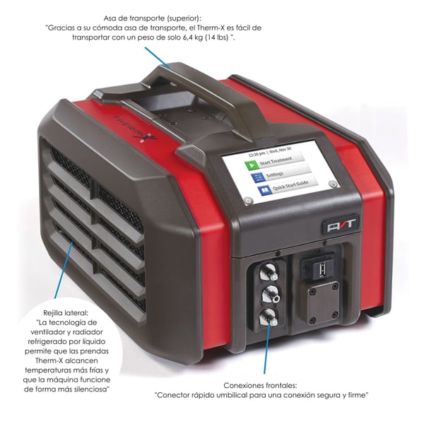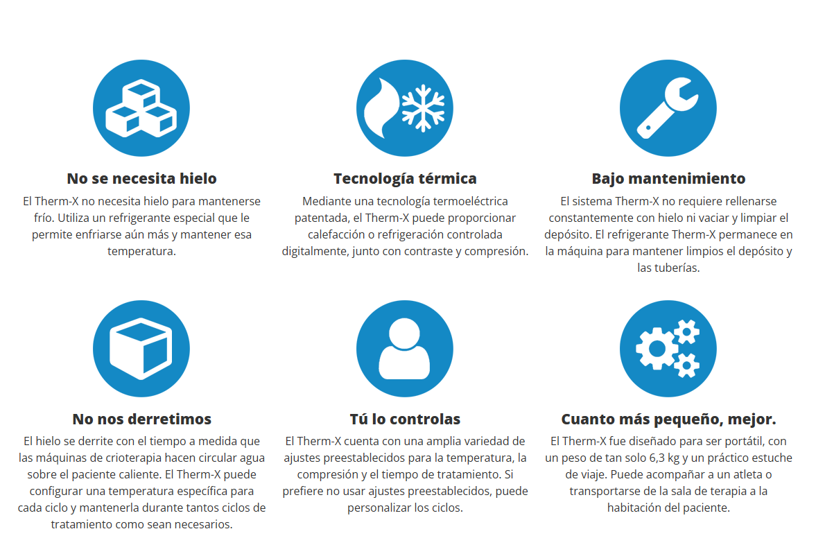 Therm-X AT associe le froid, la chaleur, le contraste et la compression. Il est indiqué pour le traitement des lésions aiguës et postopératoires, la réduction des œdèmes, des gonflements et des douleurs pour lesquels le froid et la compression sont recommandés. Il est également indiqué pour le traitement des affections médicales et/ou chirurgicales post-traumatiques et postopératoires nécessitant une thermothérapie localisée (froid ou chaleur).