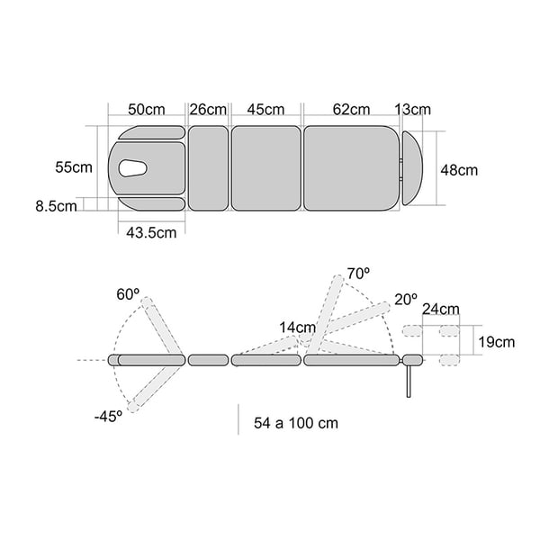- Fonctions du levier : pliage central, dossier, Trendelenburg