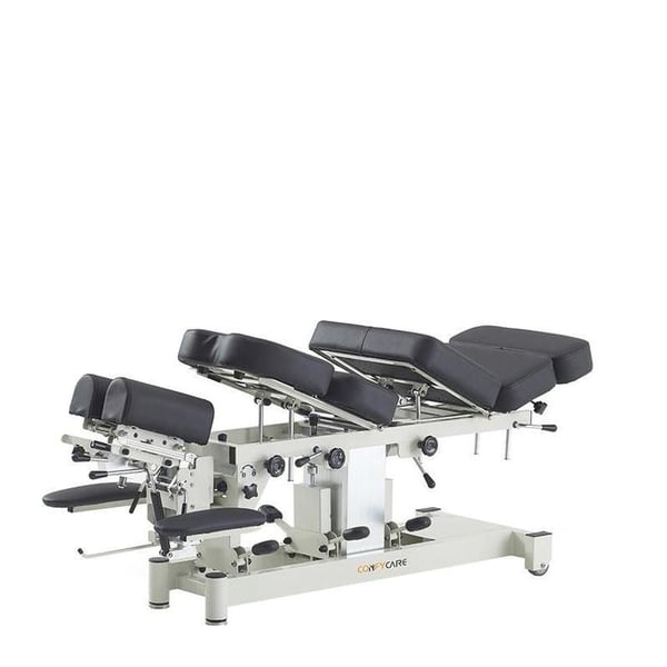 La table de traitement Coinfycare APPA est une table électrique haut de gamme conçue pour les professionnels de la chiropratique et des thérapies manuelles avancées . Sa structure centrale robuste supporte jusqu'à 250 kg et offre une surface divisée en 6 sections pour une adaptation anatomique optimale. Elle est dotée de 4 positions de réglage (cervicale, thoracique, lombaire et pelvienne) actionnées par une pédale pour faciliter des techniques de flexion et de distraction précises. Le réglage électrique de la hauteur est également commandé par une pédale , garantissant une ergonomie optimale pour le thérapeute tout au long du traitement. Son revêtement ignifuge, antibactérien et haute densité offre confort et durabilité dans les environnements cliniques exigeants.