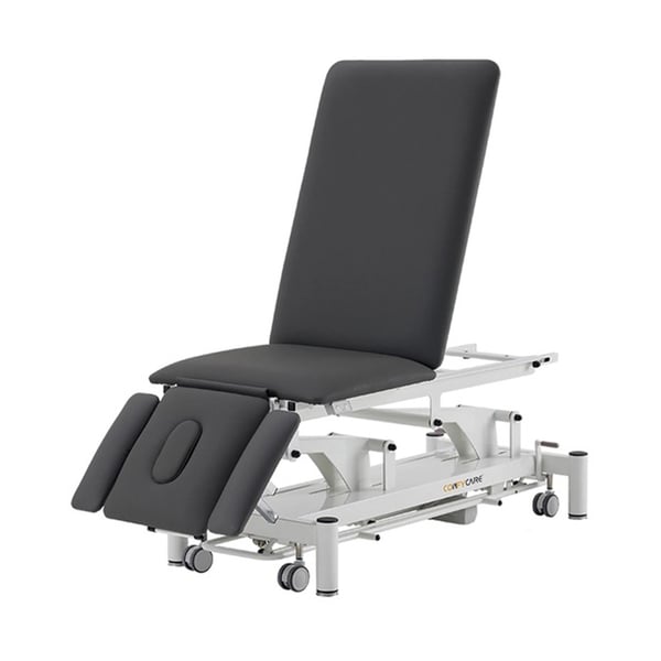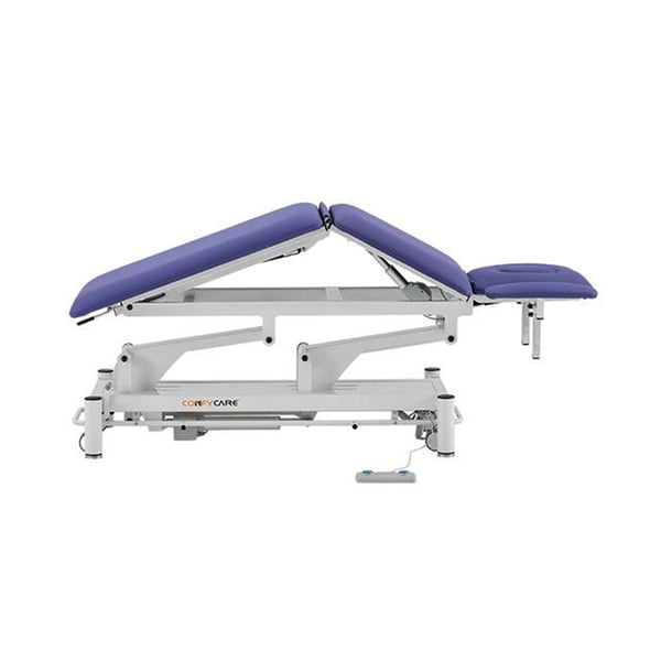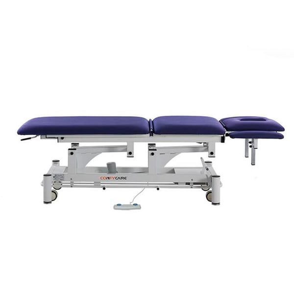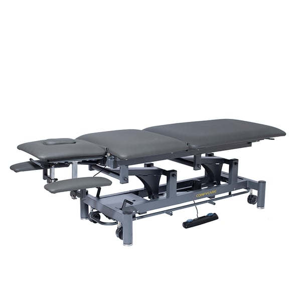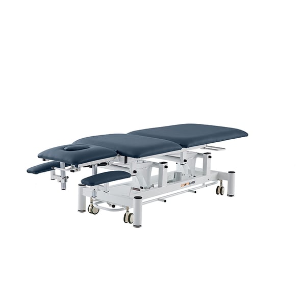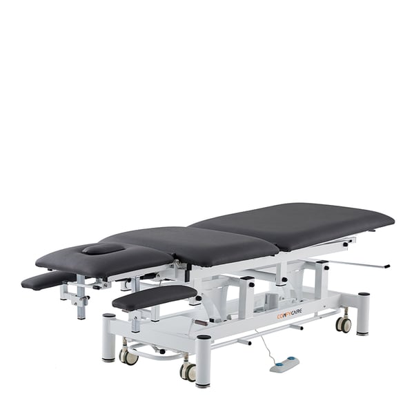 Table électrique Nott Coinfycare : cinq sections, triple moteur, accoudoirs rabattables et revêtement en polyuréthane pour l'esthétique et la physiothérapie
