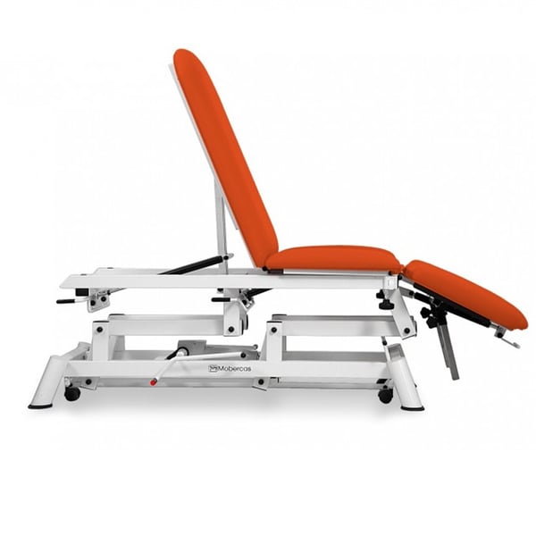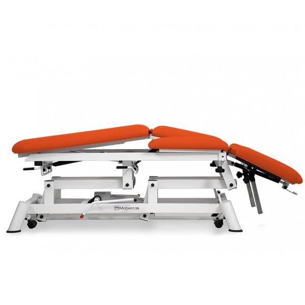 Table de traitement ostéopathique hydraulique multifonctionnelle à neuf sections et dossier inclinable négatif . Elle comprend des accoudoirs réglables en hauteur et en largeur à la hauteur du dossier, avec des bras plats, rembourrés et pivotants, un pli central , une position Trendelenburg avec supports d'épaules, un appui-tête et des roues rétractables .