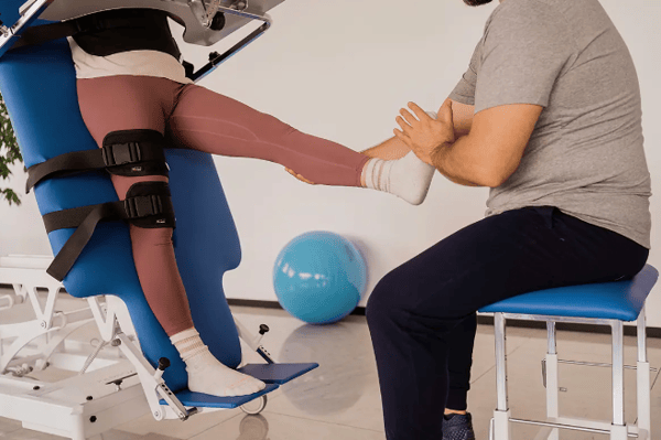 - Le guide central facilite la fixation des 5 sangles de sécurité aux membres inférieurs ; il permet également de libérer un membre pour d'éventuels exercices prescrits par le thérapeute.