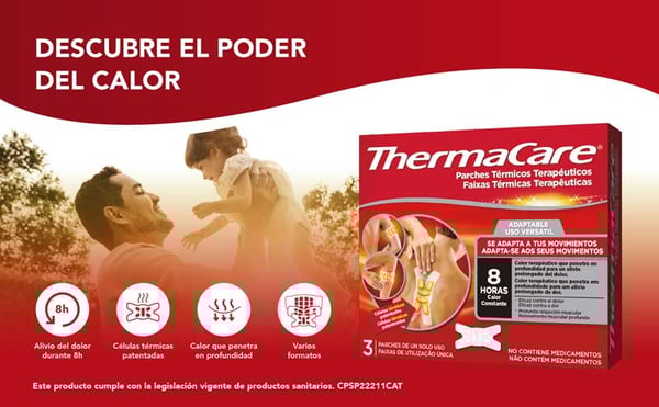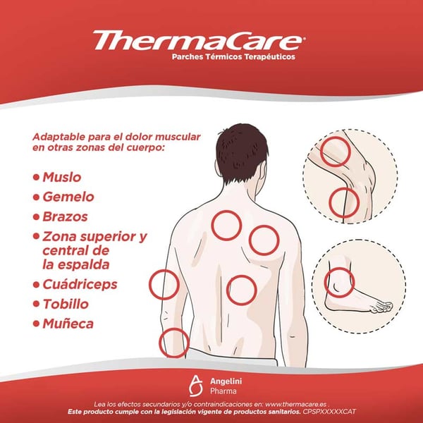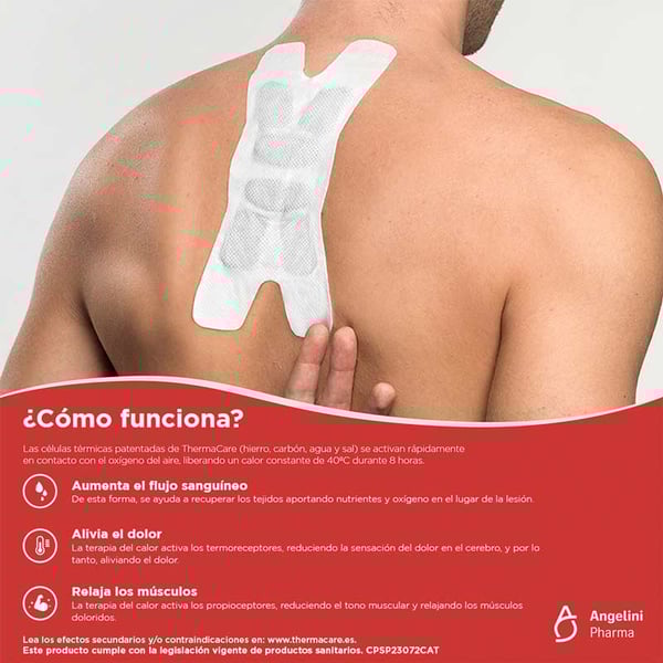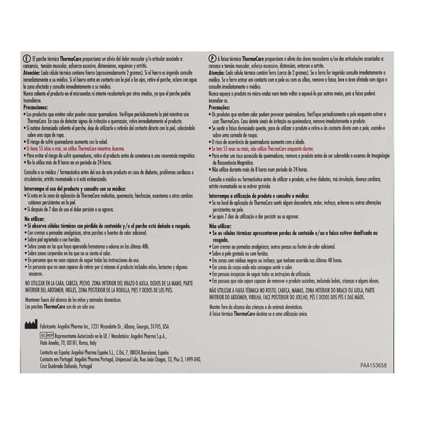 Chaque cellule thermique contient du fer (environ 2 grammes). En cas d'ingestion de fer, consultez immédiatement votre médecin. Si le fer entre en contact avec votre peau ou vos yeux, retirez le patch, rincez la zone affectée avec de l'eau et consultez immédiatement votre médecin. Ne chauffez jamais le produit au micro-ondes et n'essayez pas de le réchauffer par d'autres moyens, car le patch pourrait prendre feu. Les produits qui émettent de la chaleur peuvent provoquer des brûlures. Vérifiez régulièrement votre peau lorsque vous utilisez ThermaCare. Si vous détectez des signes d'irritation ou de brûlure, retirez immédiatement le produit. • Si le patch est trop chaud, arrêtez de l'utiliser ou retirez-le du contact direct avec la peau en le plaçant sur une couche de vêtements. • Pour vérifier votre sensibilité à la chaleur, la première application du patch doit avoir lieu pendant la journée, lorsque vous êtes éveillé. • Le risque de brûlures augmente avec l'âge. Si vous avez 55 ans ou plus, n'utilisez pas ThermaCare pendant que vous dormez. N'exercez pas de pression supplémentaire sur le produit (par exemple en vous appuyant sur des surfaces dures, en le portant sous des vêtements serrés ou avec une ceinture très serrée). Ne l'utilisez pas plus de 8 heures sur une période de 24 heures. Arrêtez d'utiliser le produit et consultez votre médecin : Si vous remarquez une gêne, une brûlure, un gonflement, une éruption cutanée ou d'autres changements cutanés persistants dans la zone d'application de ThermaCare. Si après 7 jours d'utilisation la douleur persiste ou s'aggrave. Tenir hors de portée des enfants et des animaux de compagnie. Ne pas utiliser si vous voyez des cellules thermiques avec perte de contenu et/ou si le patch est endommagé ou déchiré. À usage unique Ne contient pas de médicaments NE PAS UTILISER LE PATCH SUR LE VISAGE, LA TÊTE, LA POITRINE, LA ZONE INTERNE DU BRAS OU DE L'ARMIPILE, LES DOIGTS DE LA MAIN, LA PARTIE INFÉRIEURE DE L'ABDOMEN, L'ANGLAIS, LA ZONE ARRIÈRE DU GENOU, DES PIEDS OU DES ORTEILS.